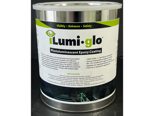 iLumi-Glo is a 100% Solids, 2-Part photoluminescent spreadable epoxy specifically formulated to be a durable, cost-effective solution for luminous safety egress markings in a wide range of building, maritime and safety applications. Its unique combination of advanced resin technology and high quality raw materials produce unequaled performance - The result is an attractive, highly durable finish, that will maintain performance standards over time. Charges with ambient light, always on. No electricity required.